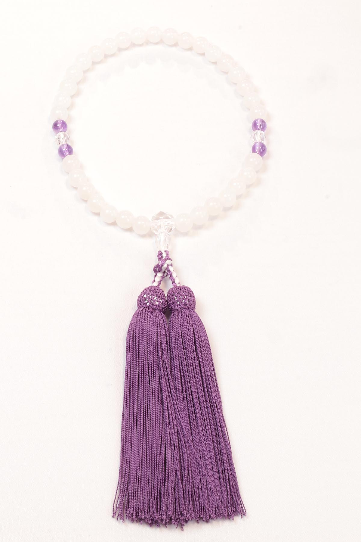 清らかなホワイトカルサイトに映える彩は、京の街並みに差し込む四季の光景を思わせ持つ人に爽やかな印象を与えます。親玉と二天玉には水晶切子を用い、清澄な輝きを添えました。
