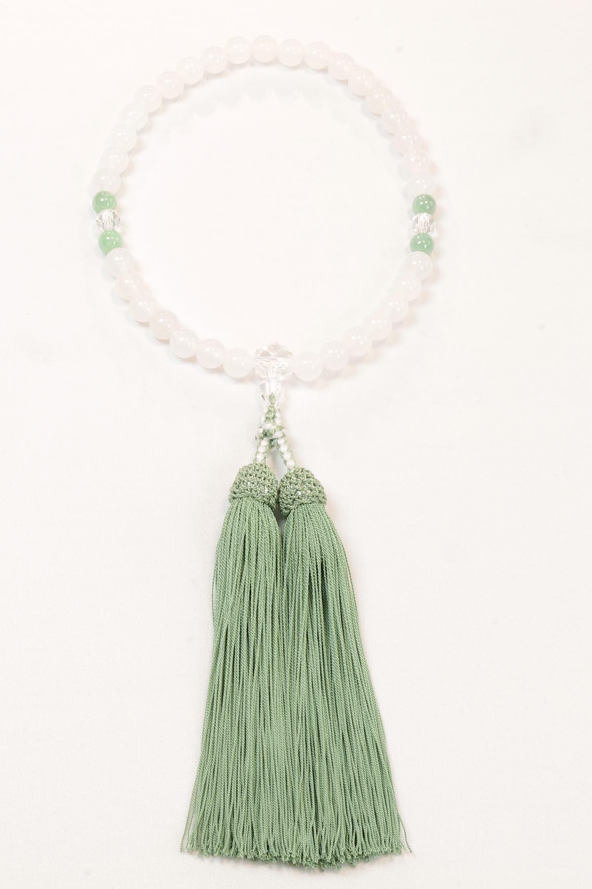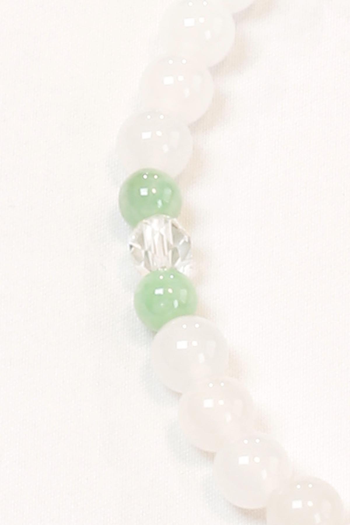 清らかなホワイトカルサイトに映える彩は、京の街並みに差し込む四季の光景を思わせ持つ人に爽やかな印象を与えます。親玉と二天玉には水晶切子を用い、清澄な輝きを添えました。